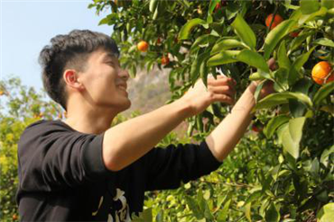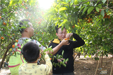 一下車,滿山的砂糖橘果園浮現眼前,樹上掛著又大又圓的果子,一眼望去,數不清的砂糖橘像一個紅燈泡,閃亮迷人。撲鼻而來的青葉香令人心曠神怡,清新的空氣游走在身體每個角落。
